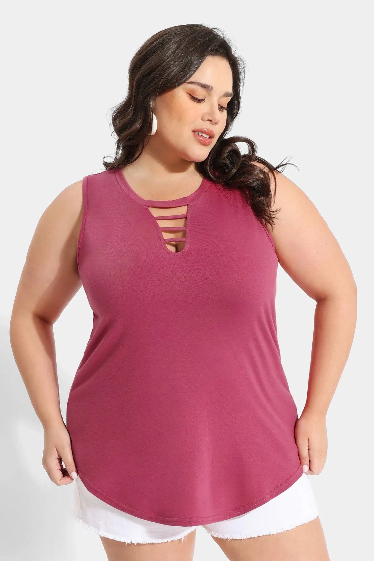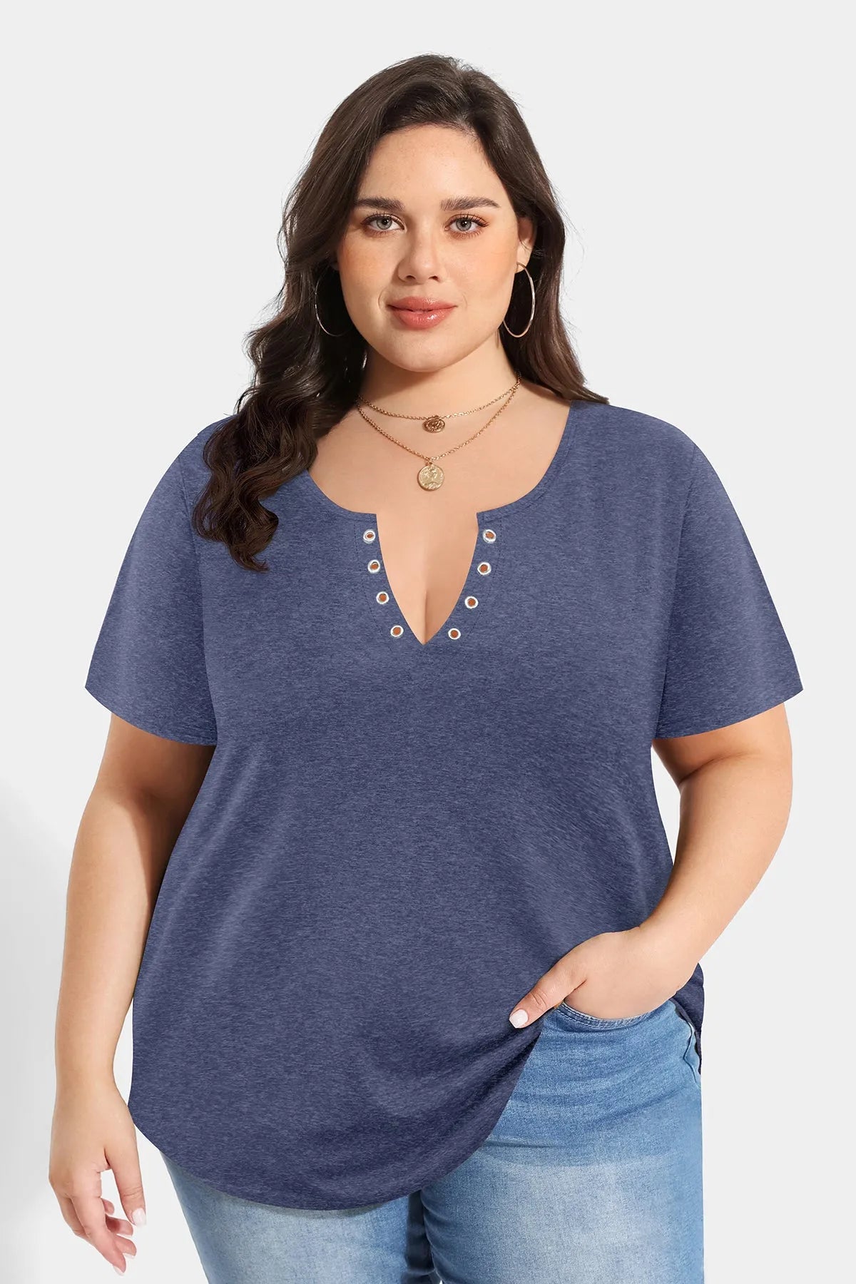 Solid Ring Hole Notched V Neck Flowy Hem T-shirt