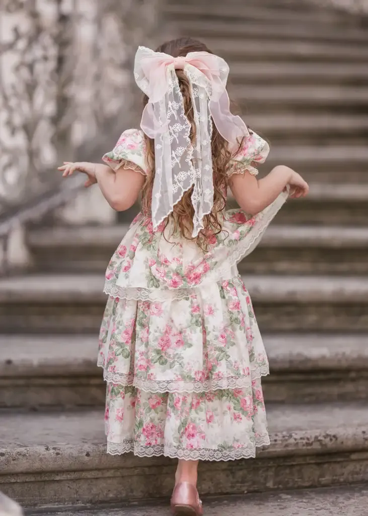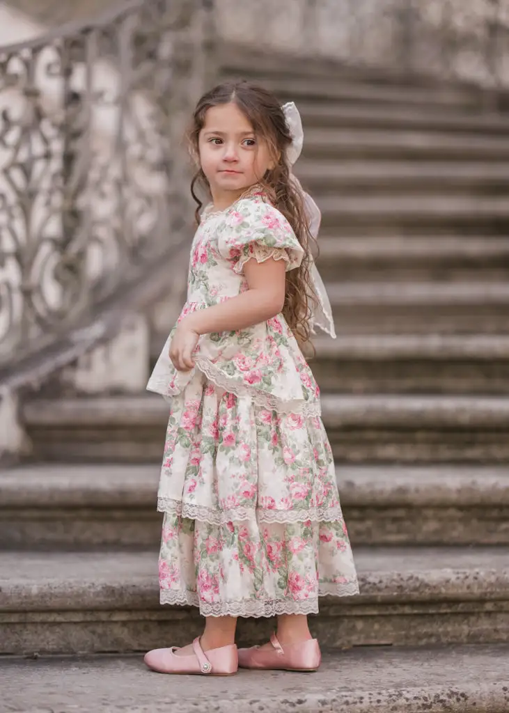 The Adeline Dress for little girls is a charming, vintage-inspired piece featuring cascading tiers of floral fabric accented with delicate lace trim. Designed with puffed sleeves and a twirl-worthy skirt, this dress captures a playful yet elegant spirit. Perfect for tea parties, special occasions, or simply making magical memories.