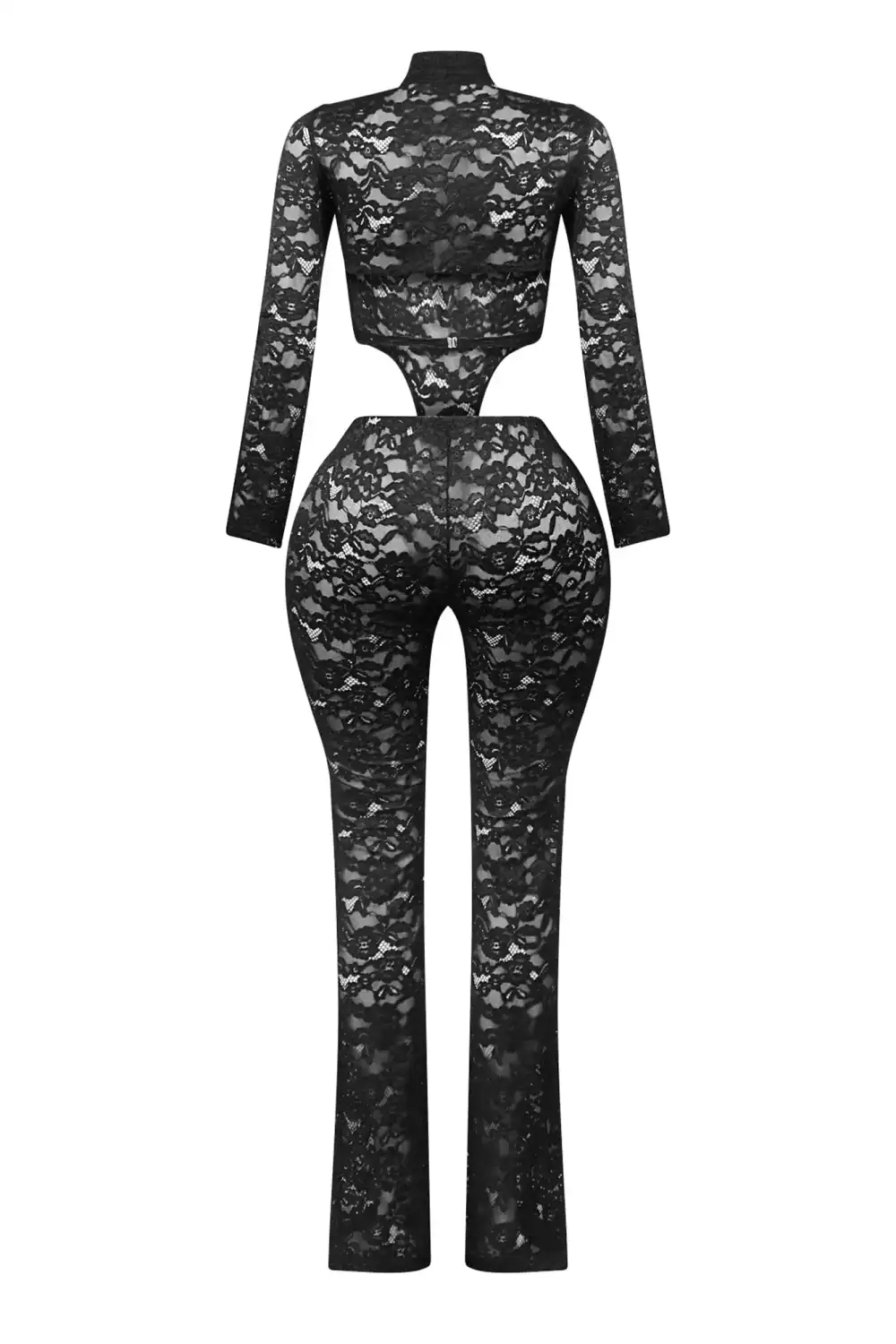 Lace mock neck long sleeve jumpsuit featuring side cutout details and underwired bustier with lace trimming