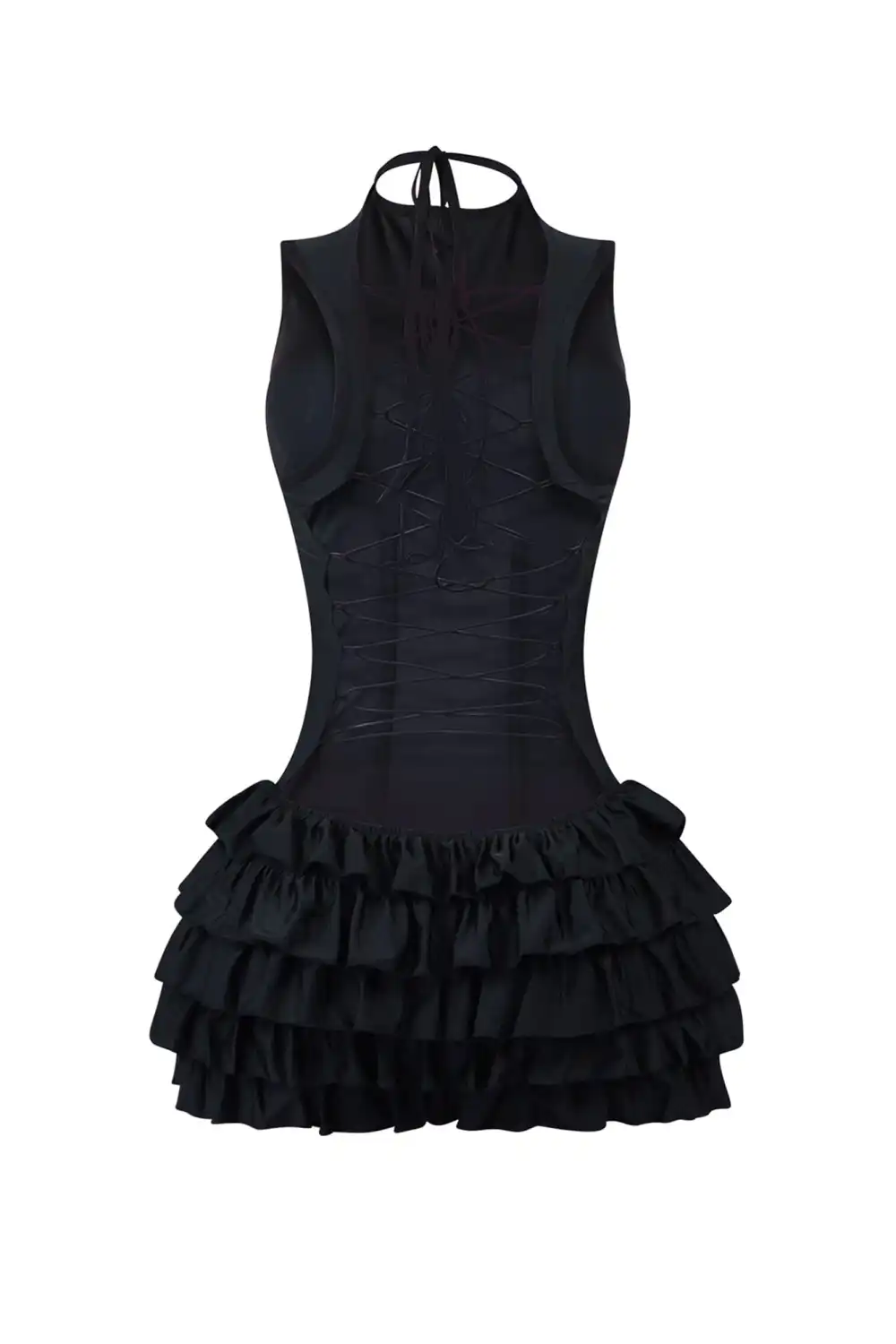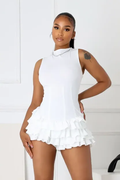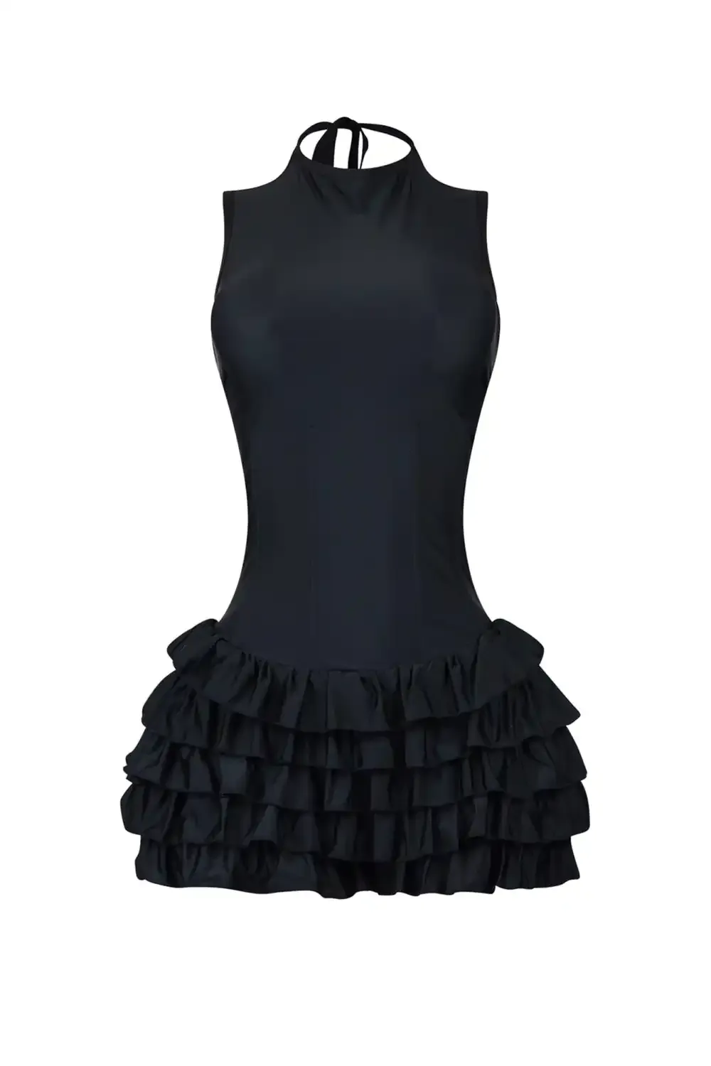 Nylon sleeveless mini dress featuring ruffle layers and boning structure for a tight fit