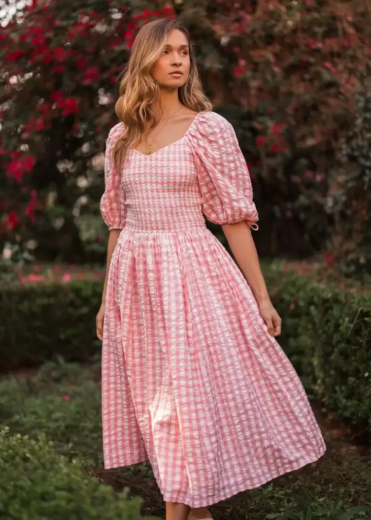 This?darling dress has an effortless fit that makes it the ultimate look-cute-without-even-trying piece. From the gingham print to the comfortable skirt, this dress has it all. Features a sweetheart neckline, smocked bodice, and lantern puff sleeves with adjustable ties. Ready for an adventure.?