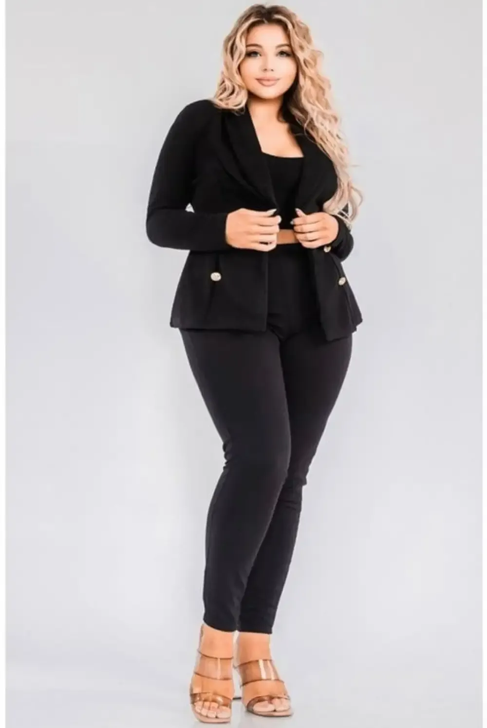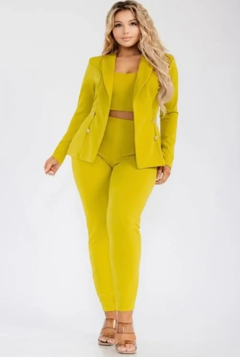 Experience the timeless glamour of this 3-piece Boss Babe Jacket Set, with a solid gold button trim! The 3/4 sleeve jacket is perfect for any occasion, and the matching skinny pants feature an elastic waistband and gold button detail. The bustier-style crop top with an elastic waistband and wide leg adds a hint of sultry style. All pieces are incredibly stretchy for comfort and a perfect fit.