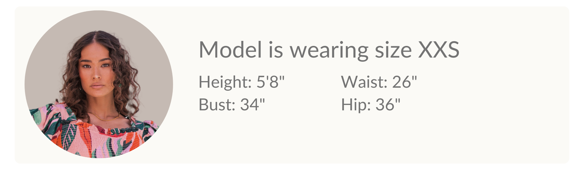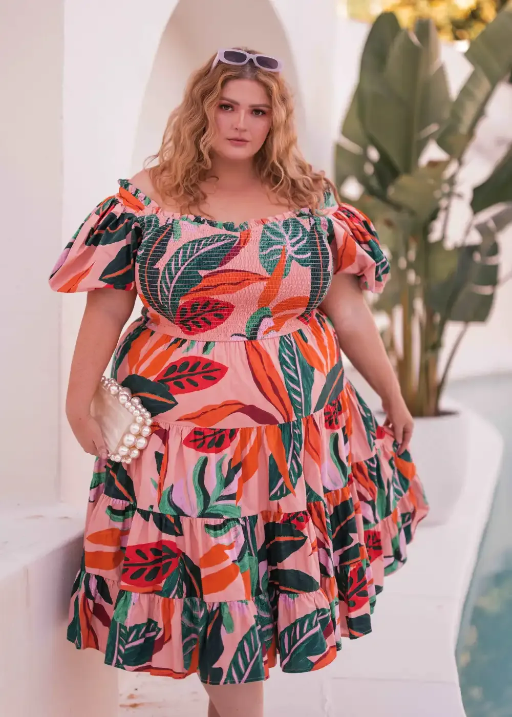 Step into a tropical haven with our pink tiered puff sleeve dress, adorned with a lush palm leaf print in vibrant shades of green, peace, and orange. The smocked bodice accentuates your figure, while the puff sleeves add a touch of playful charm. Perfect for coastal getaways or sunny seaside strolls, this dress exudes an earthy, botanical elegance that will make you feel like you're surrounded by nature's beauty wherever you go.