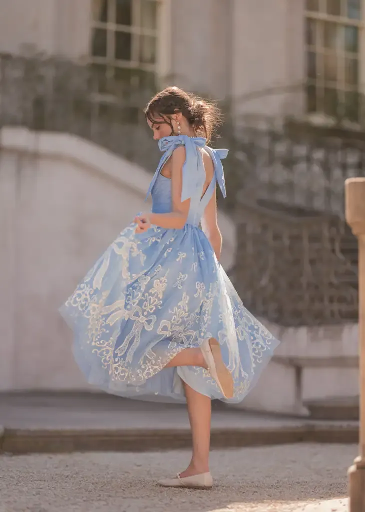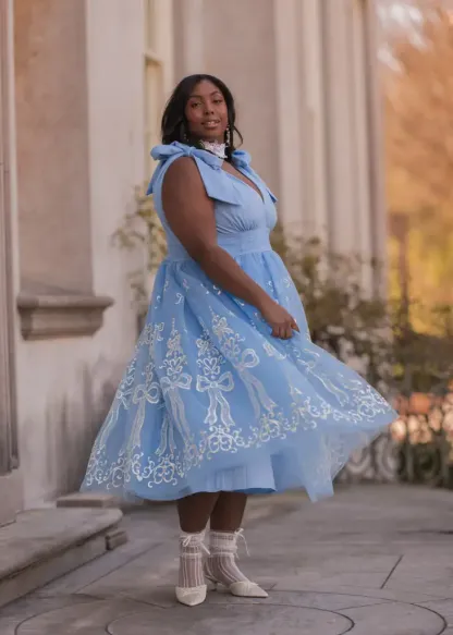 The Cindy Dress is a fairytale-inspired design, featuring a dreamy blue tulle overlay embellished with intricate white bow embroidery. With elegant bow-tied straps, a flattering V-neckline, and a voluminous skirt, this dress exudes timeless charm and grace. Perfect for special occasions, it’s a captivating choice for making unforgettable memories.