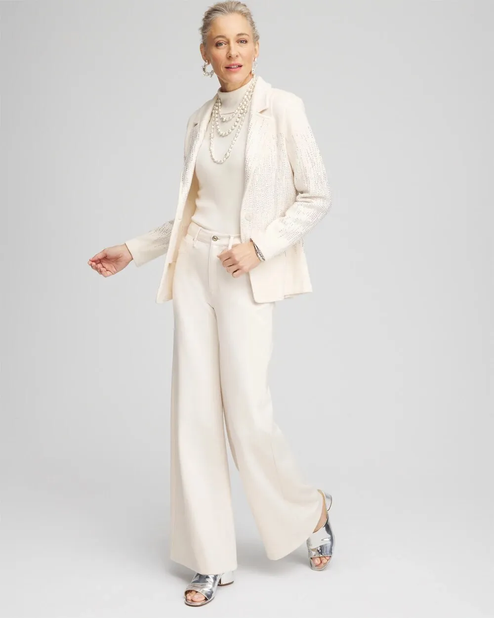 Plan to make this new most-loved Embellished Sweater Blazer your glamorous go-to. This blazer features cascading embellishements on the front, back, and sleeves, as well as side welt pockets and a single button closure. Paired with our Brigitte pants, skirts, or jeans, it's sure to become your favorite elevated look.