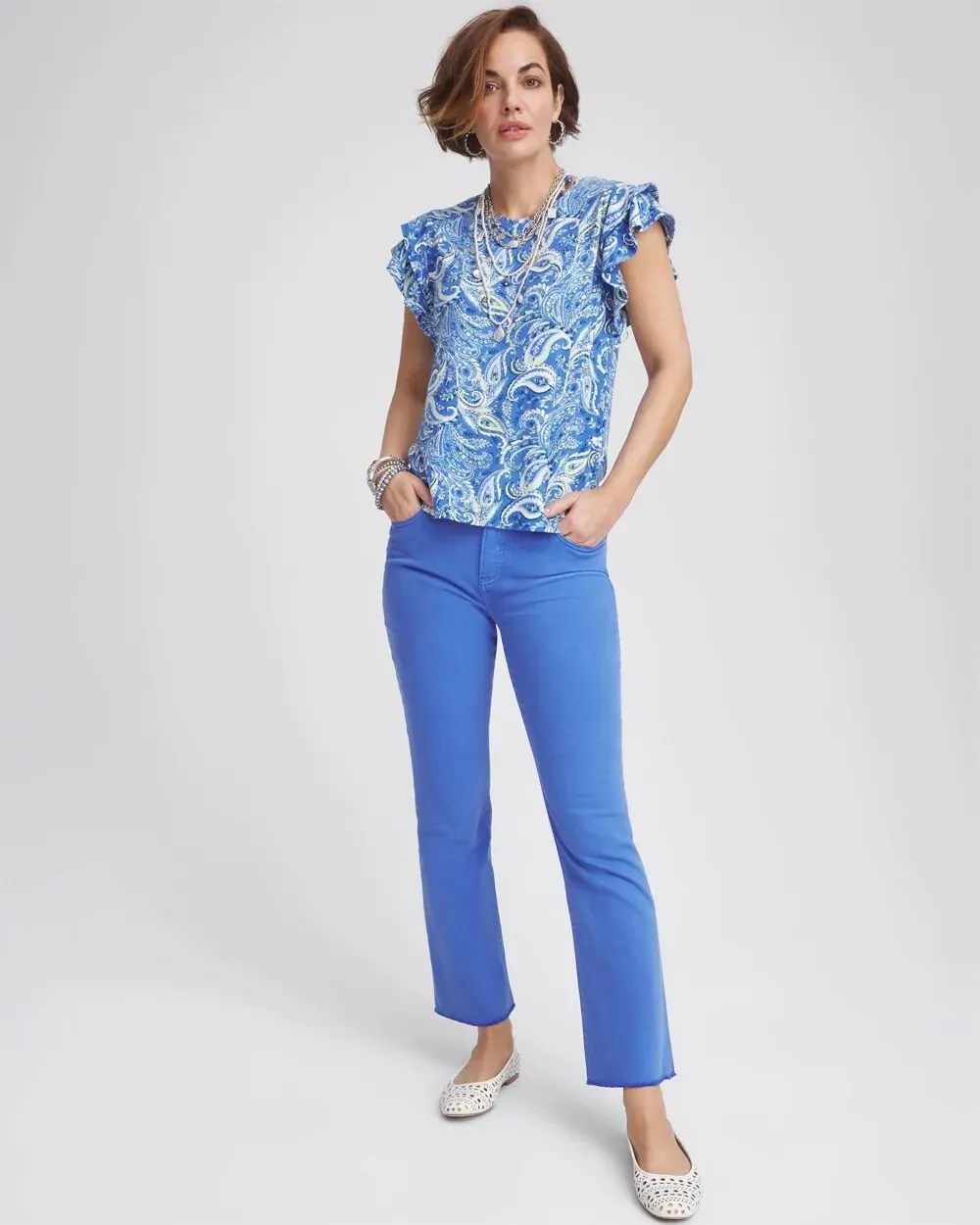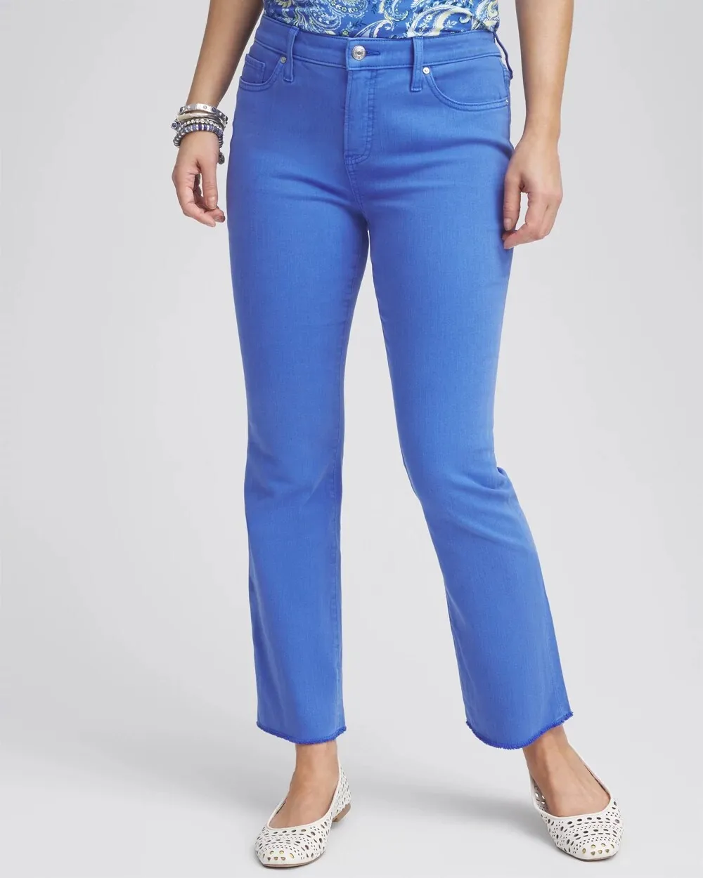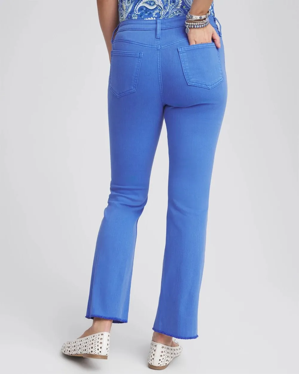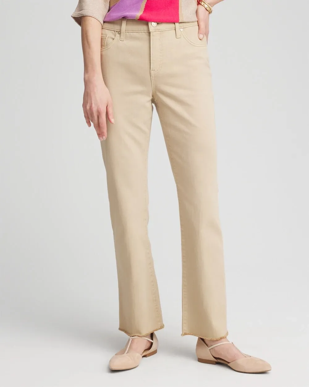 Try on our newest style, the Girlfriend Fray Hem Kick Flare Jeans. This debut line of So Slimming® bottoms are still made with our stretch fabric that smooths your waistline, now with a kick flare design that has slim fit leg, ankle-grazing shape, and fray hem flare. Pair this new design with tees and fashion tops.