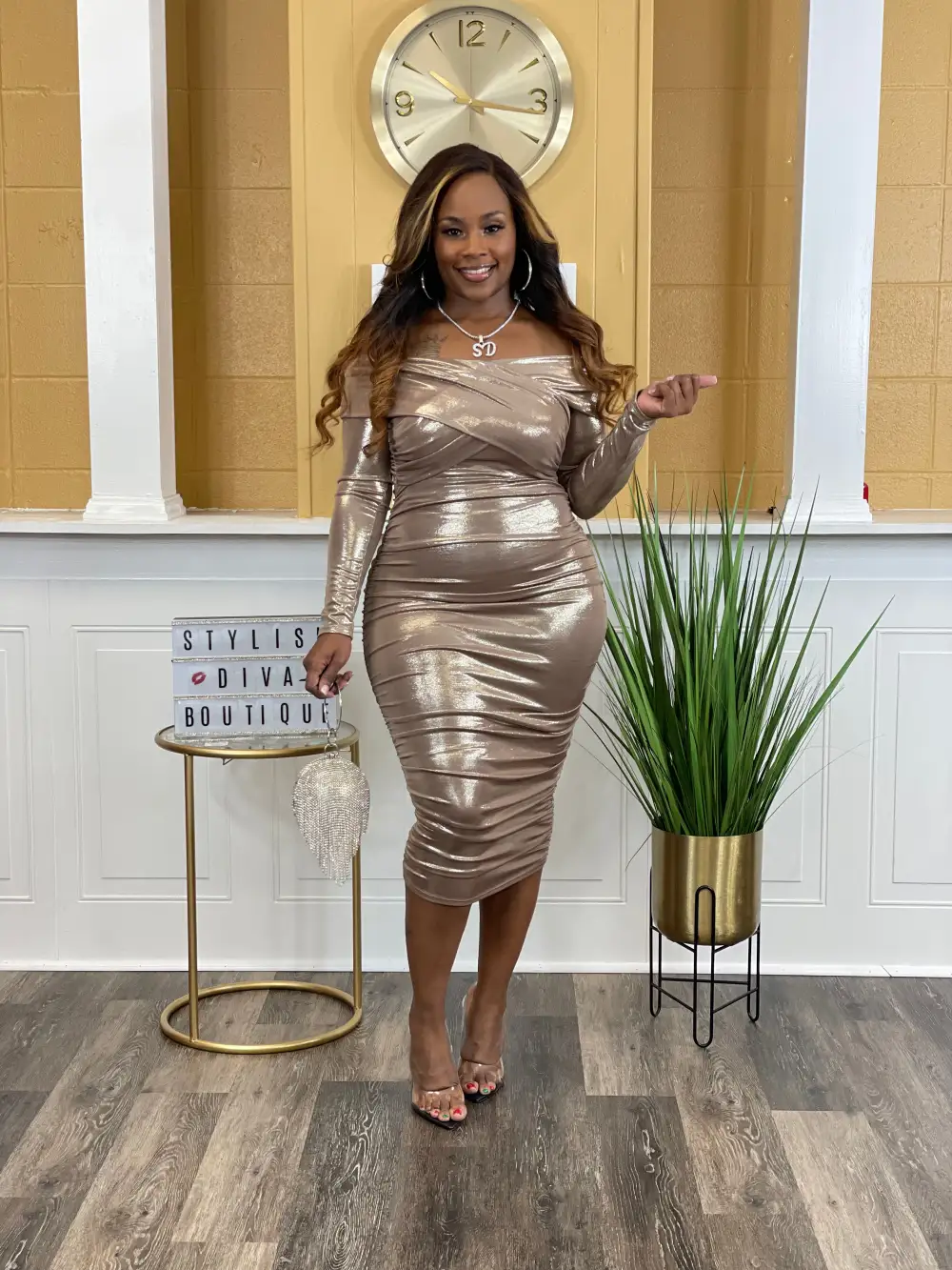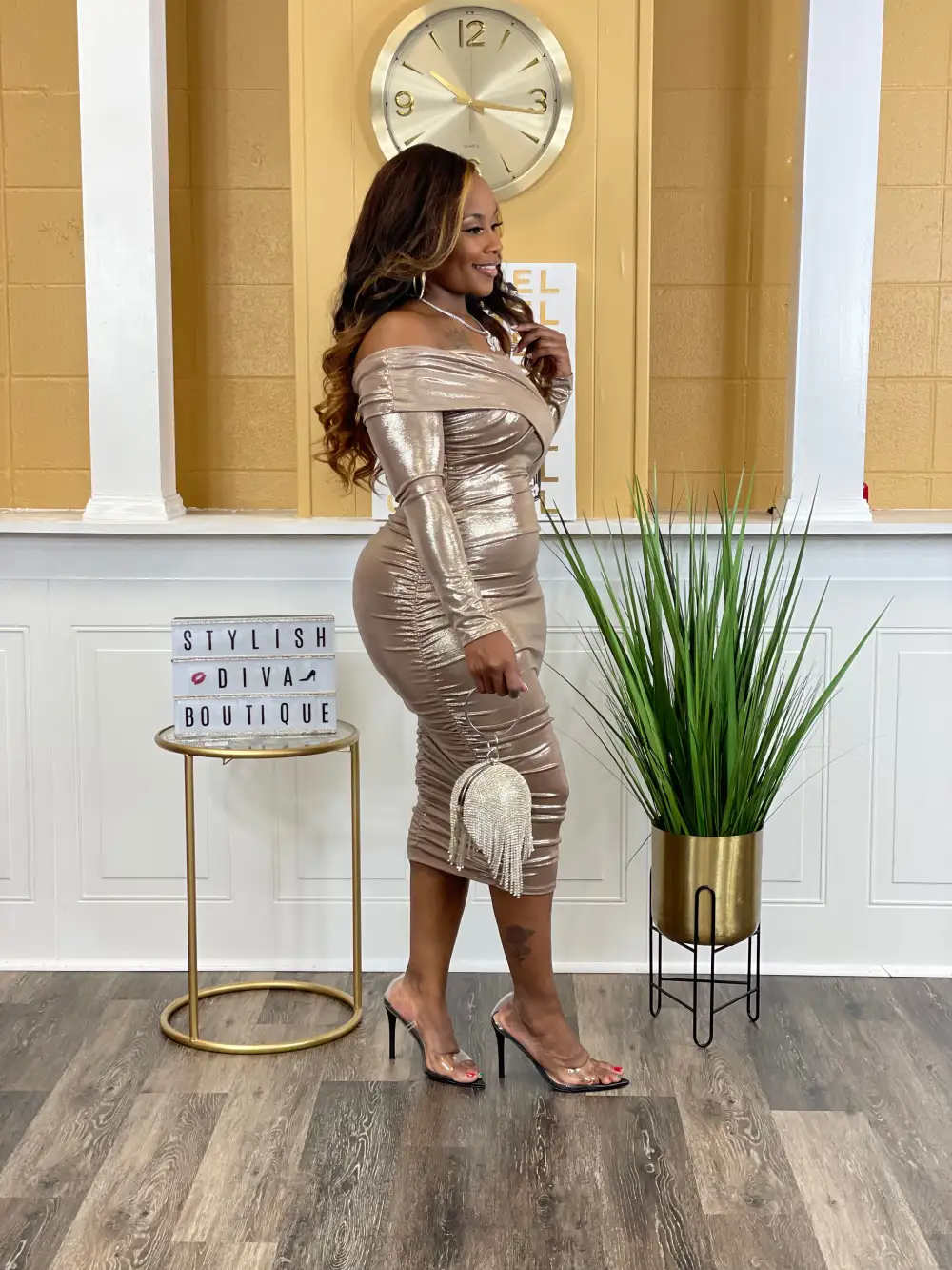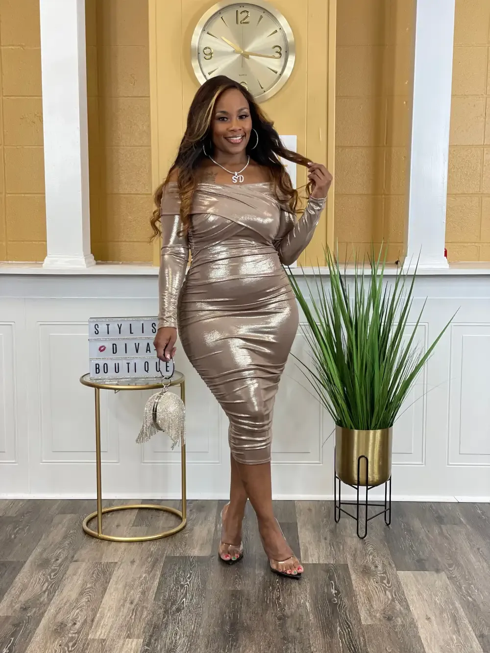 METALLIC OFF SHOULDER CROSS SHOULDER BAND MIDI DRESS