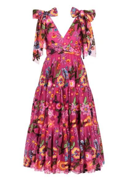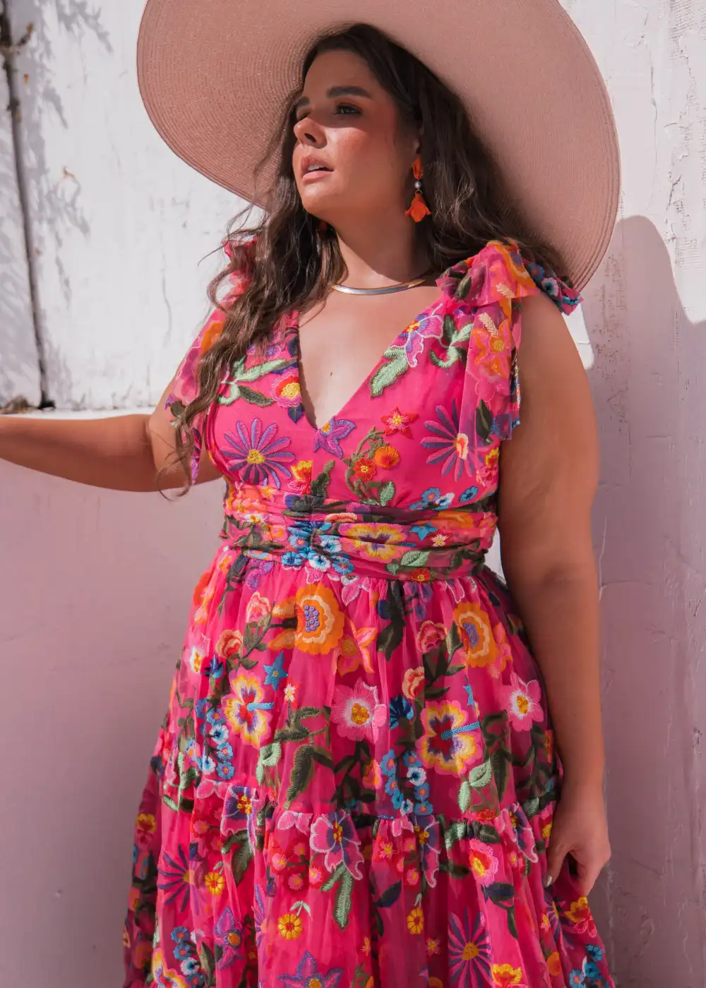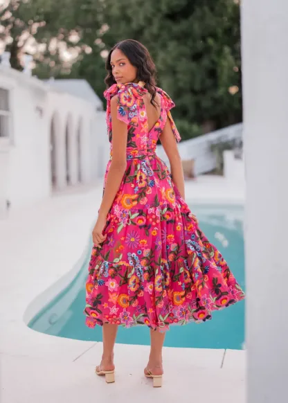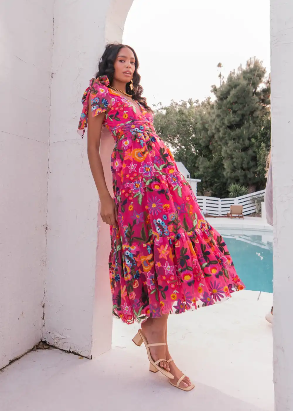 Introducing our enchanting "Hibiscus" dress, the crown jewel of our Paradise Collection. This v-neck wonder boasts a passionate fuchsia tone, adorned with a burst of mystical tropical floral embroideries in a vibrant rainbow palette. With its tie sleeves adding a touch of romance, this dress evokes the essence of colorful joy, making it a magical choice for any occasion. Let the allure of hibiscus blooms transport you to a world of tropical splendor wherever you go.