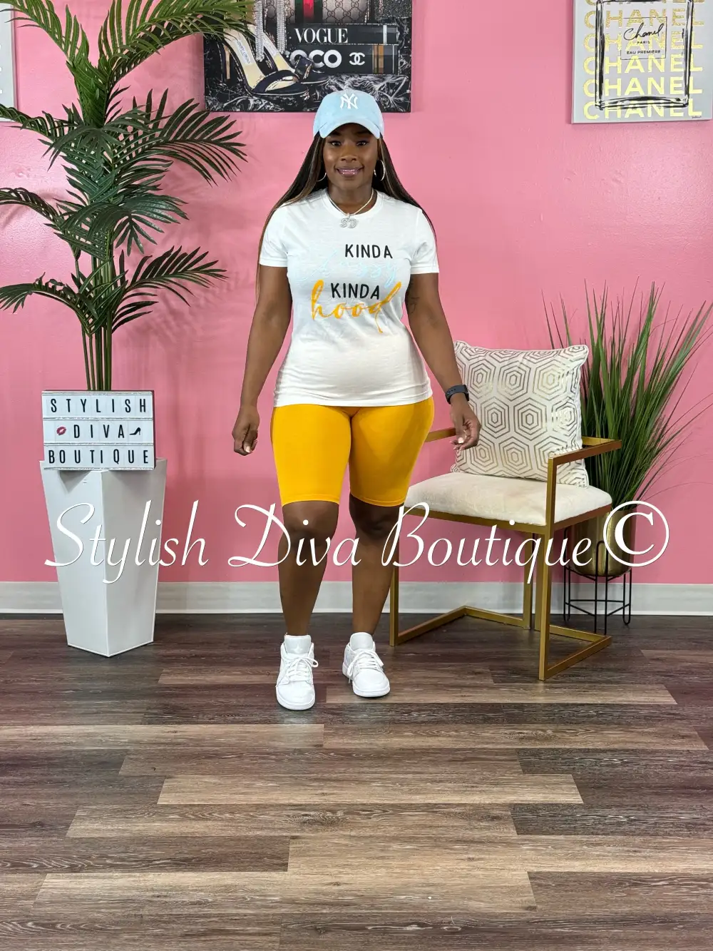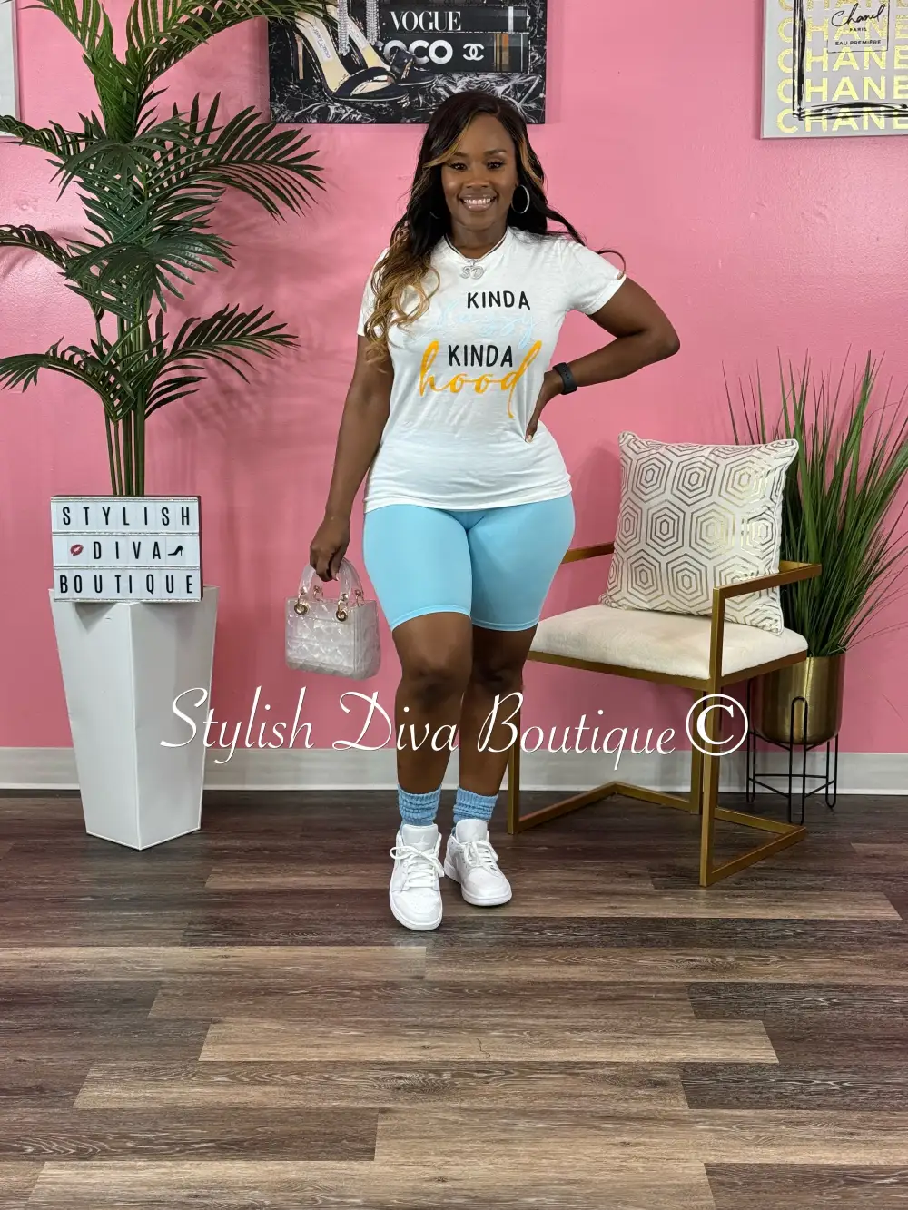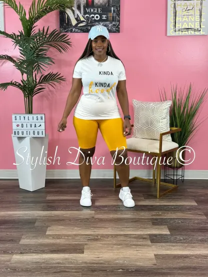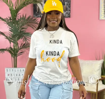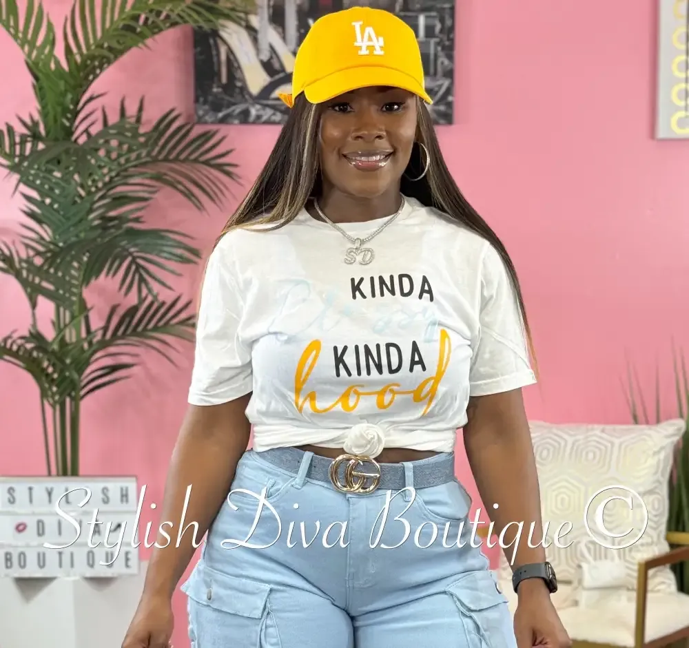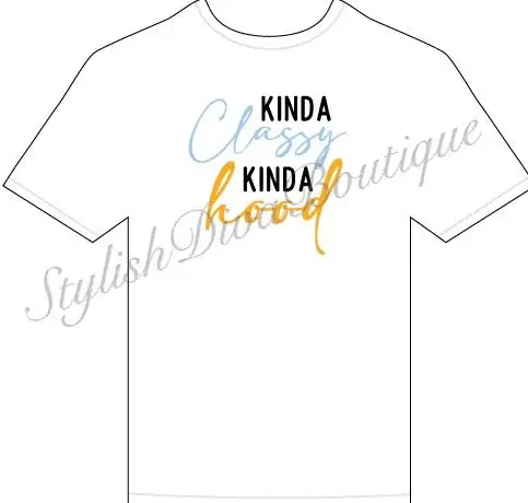 Kinda Classy Kinda Hood T-Shirt (White/Black, Blue, & Yellow Print)