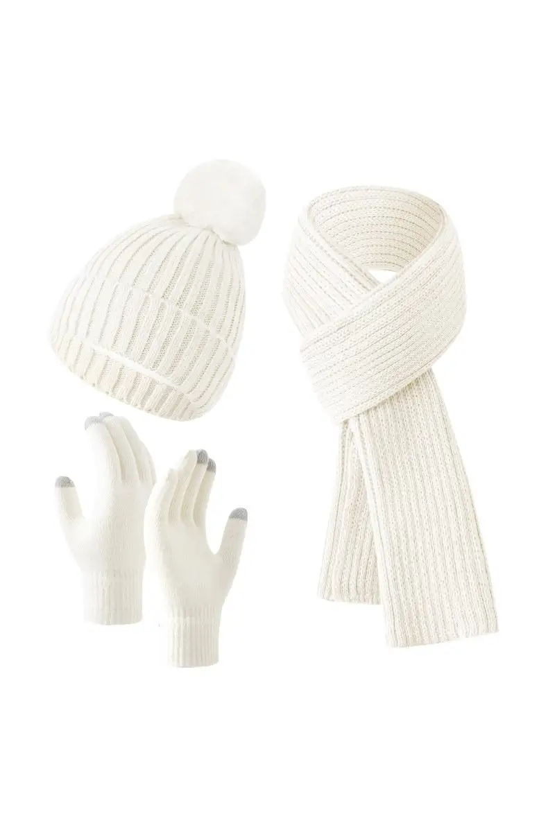 Knitted Hat, Double-layer Fleece Warm Wool Scarf, Gloves, Three-piece Set