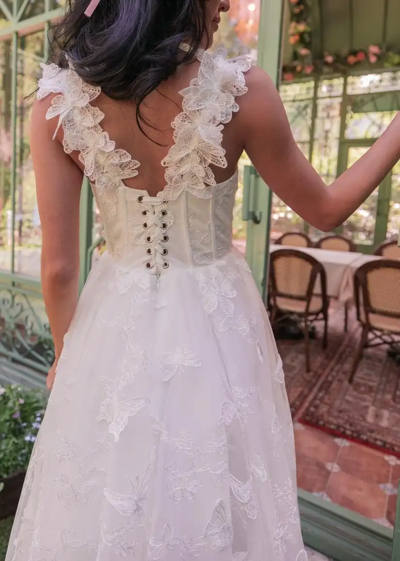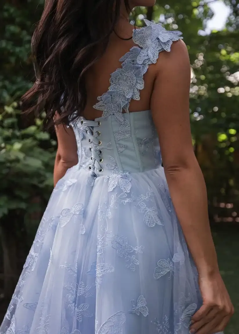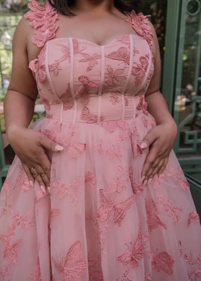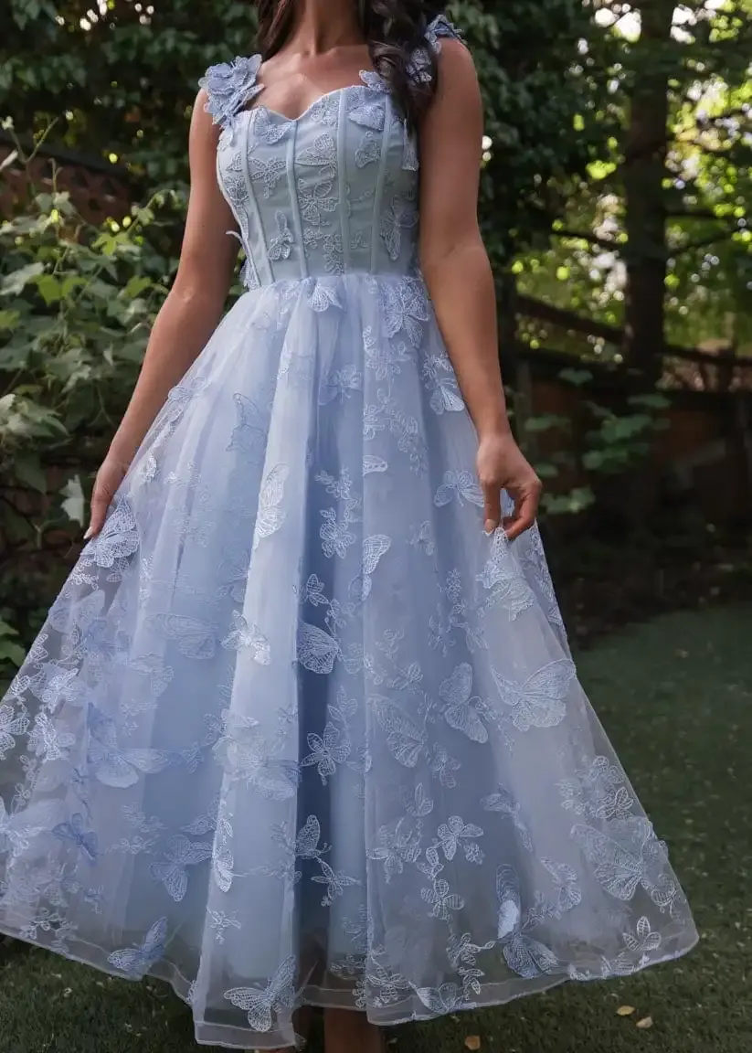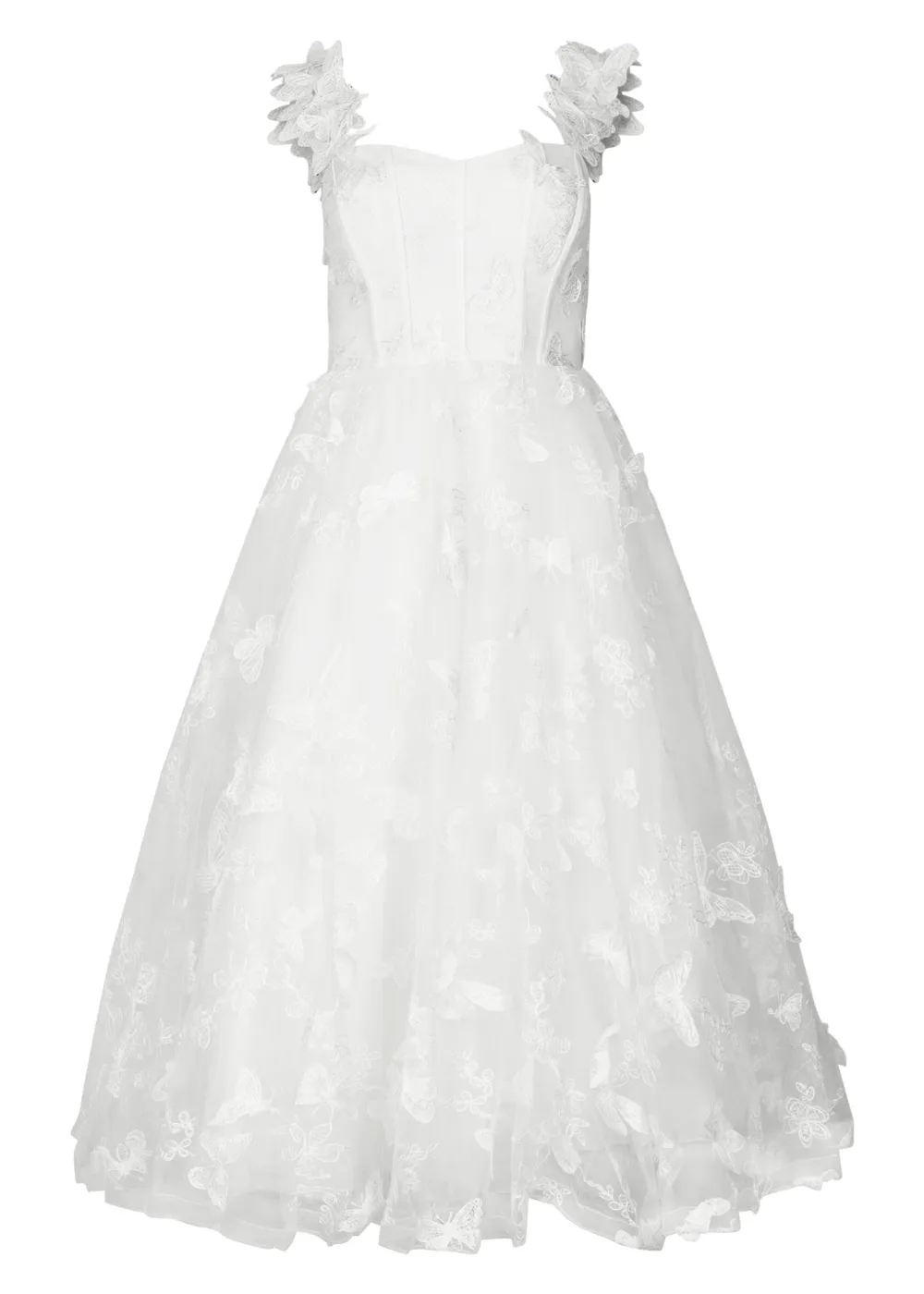 Step into a fairytale with the Mariposa Dress - a vision of elegance and enchantment. This exquisite gown, adorned with delicate butterfly appliqués, exudes a whimsical charm that will make you feel like royalty. Its soft hue of pink, white, or blue combined with intricate lace detailing create a dreamy, ethereal look, perfect for any special occasion. Designed with a flattering sweetheart neckline and a flowing A-line silhouette, this dress offers both comfort and grace. The Mariposa Dress is completed with a floral crown, adding a touch of natural beauty and sophistication. Embrace the magic and let your inner princess shine.