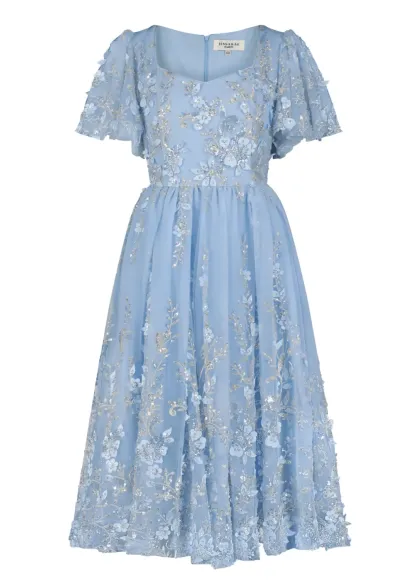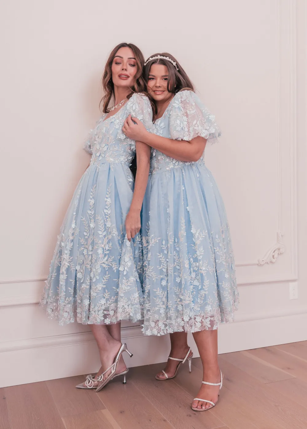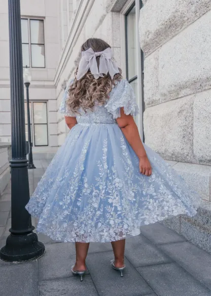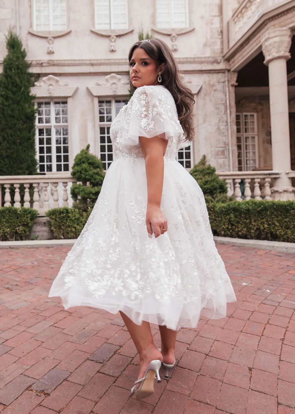 Designed for the modern-day queen, this dress features a flattering silhouette, a graceful A-line cut, and delicate floral appliqués. Perfect for formal events, rehearsal dinners, or even a romantic evening out, this dress adapts to your every whim.