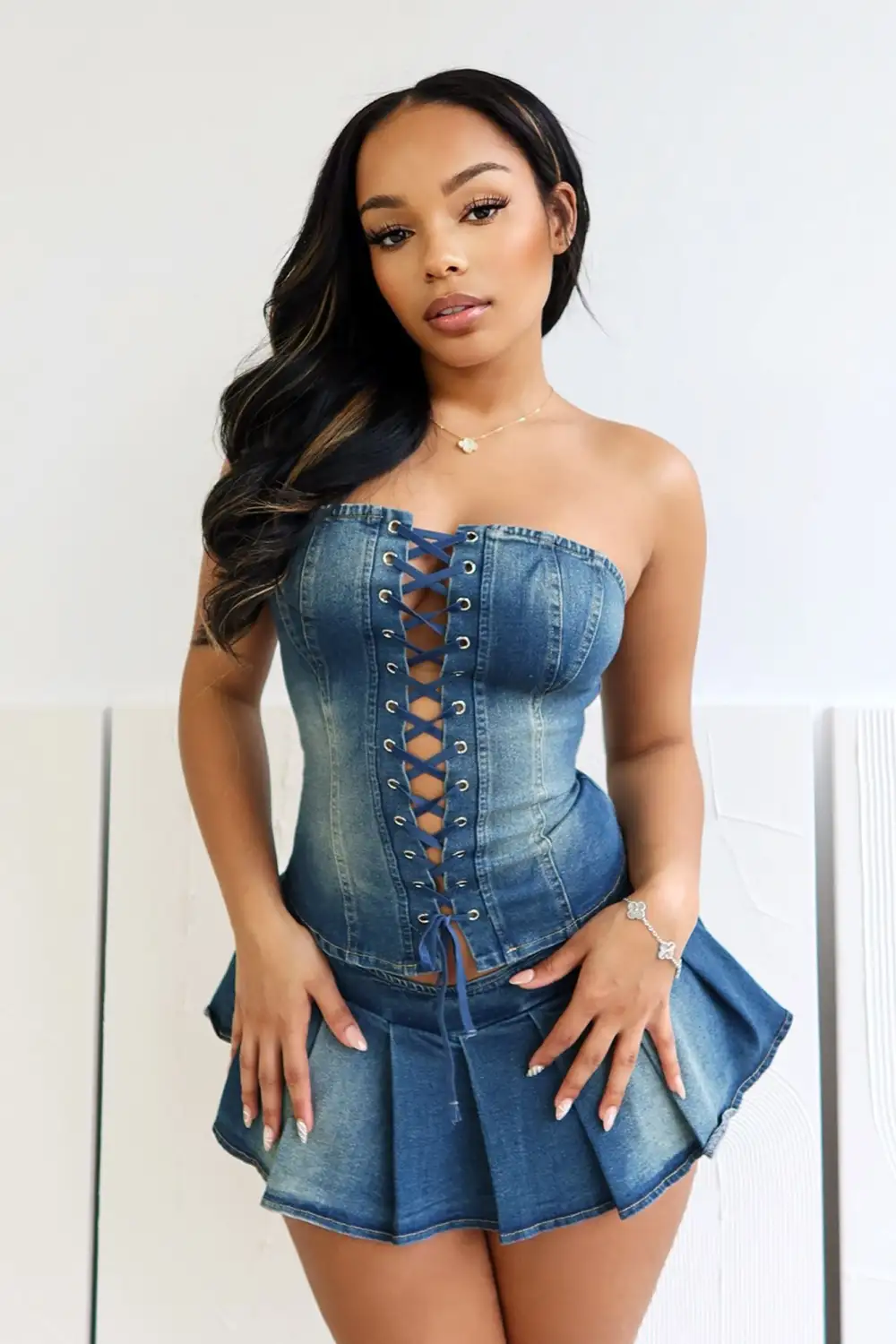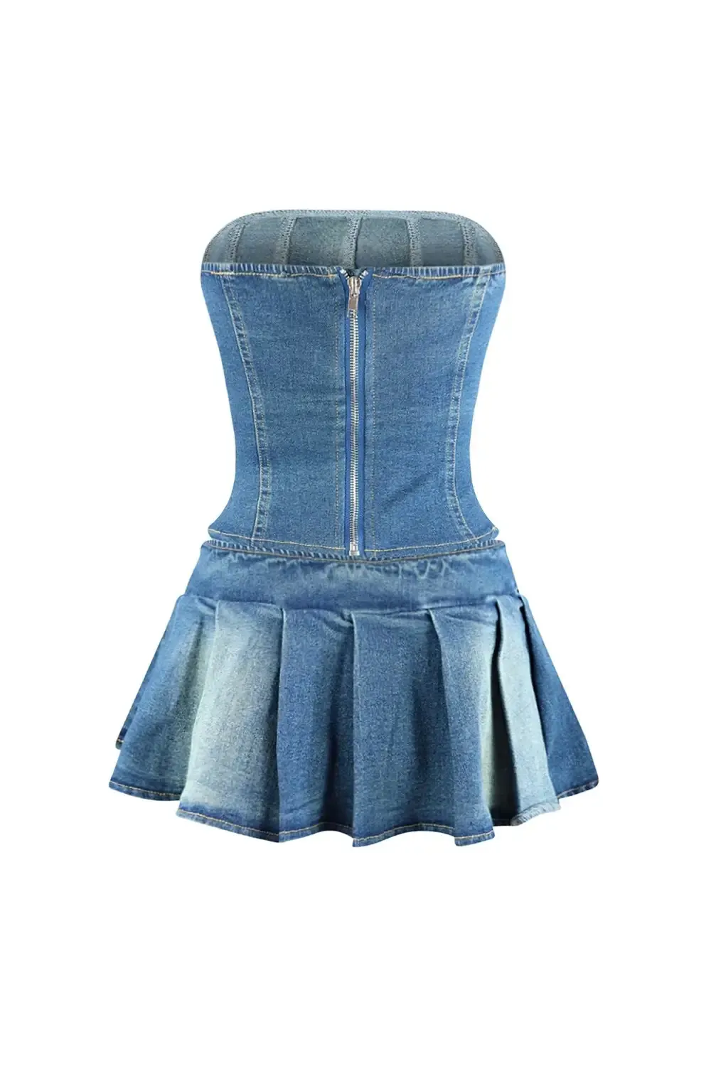 Vintage washed denim tube corset top featuring a back zipper closure with lace up front eyelet