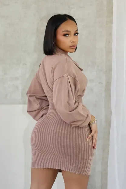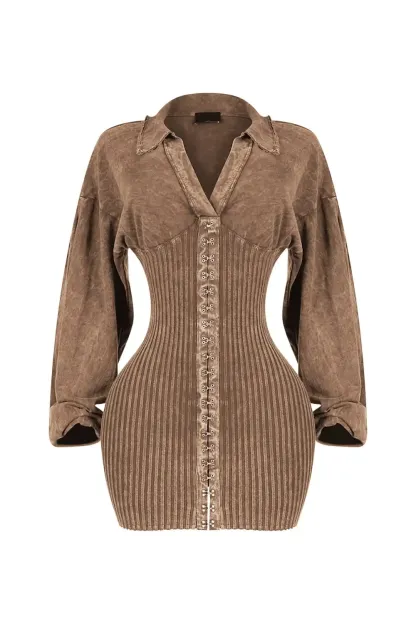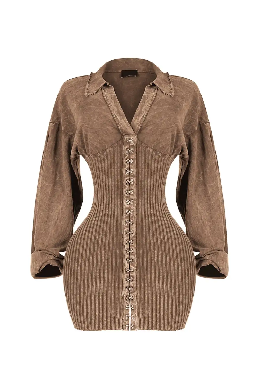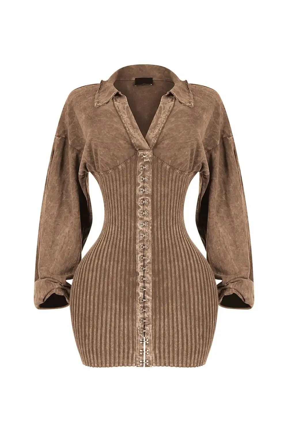 Mineral washed long sleeve collared mini dress featuring corset with hook details