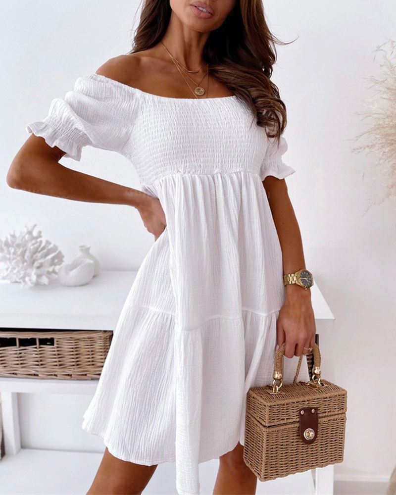 Off Shoulder Shirred Flowy Swing Dress