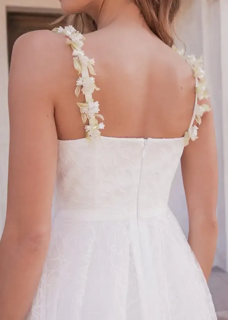 The Phiona Dress is an ethereal blend of modern elegance and timeless charm. Featuring intricate floral embroidery over a flowing white silhouette, this dress is perfect for creating a statement at any special occasion. Delicate floral straps add a whimsical touch, while the structured bodice ensures a flattering fit. Whether for a wedding or a formal event, the Phiona Dress embodies graceful sophistication.