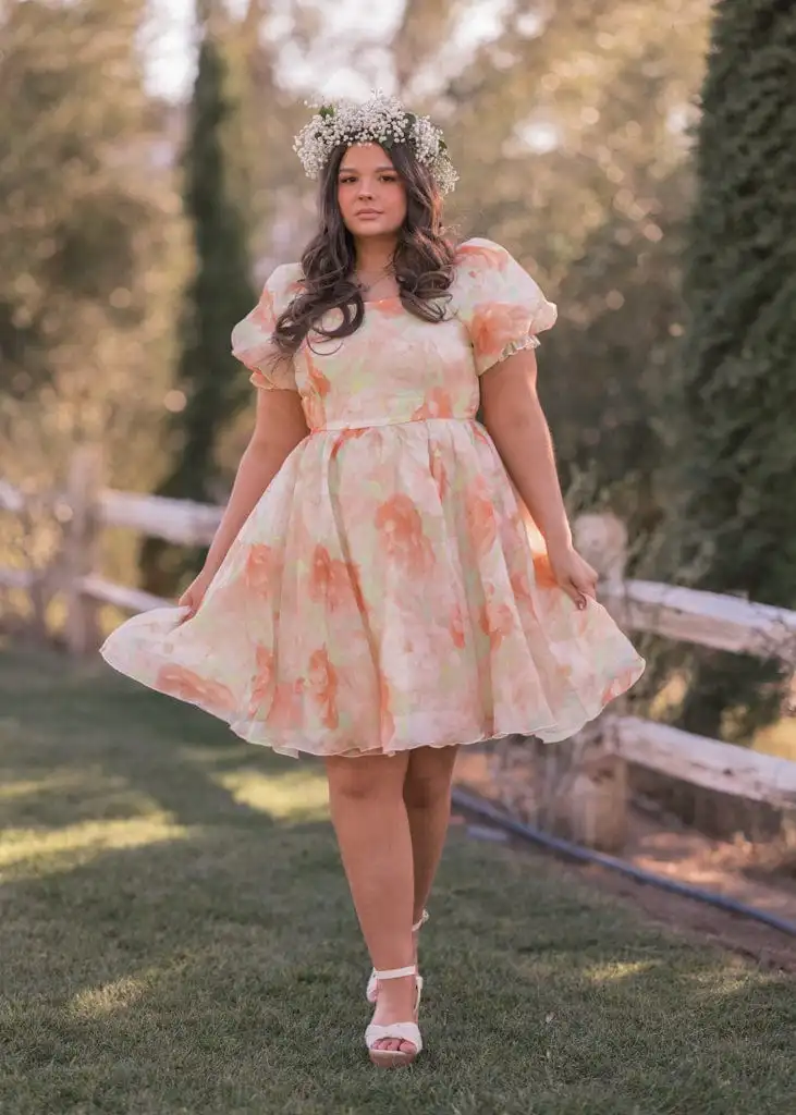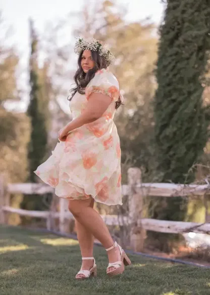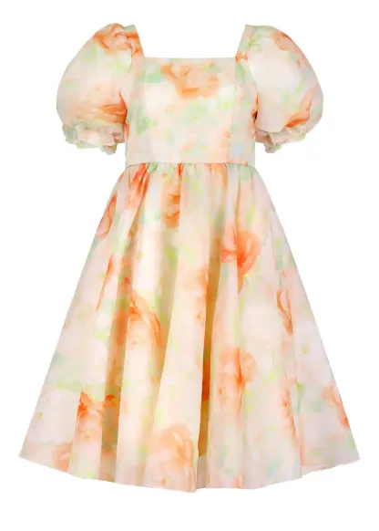 Meet the Poppy Dress, a breath of fresh air wrapped in dreamy florals. With its soft watercolor blooms in peachy hues and romantic puff sleeves, this dress is the perfect blend of elegance and whimsy. The twirl-worthy silhouette makes it ideal for garden picnics, afternoon tea, or simply feeling like a walking daydream. Effortlessly charming, this dress is made for moments that bloom!