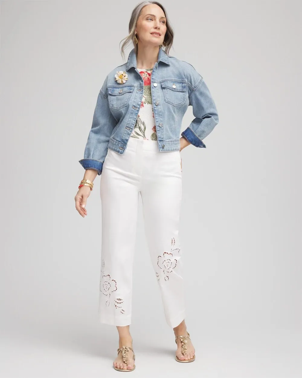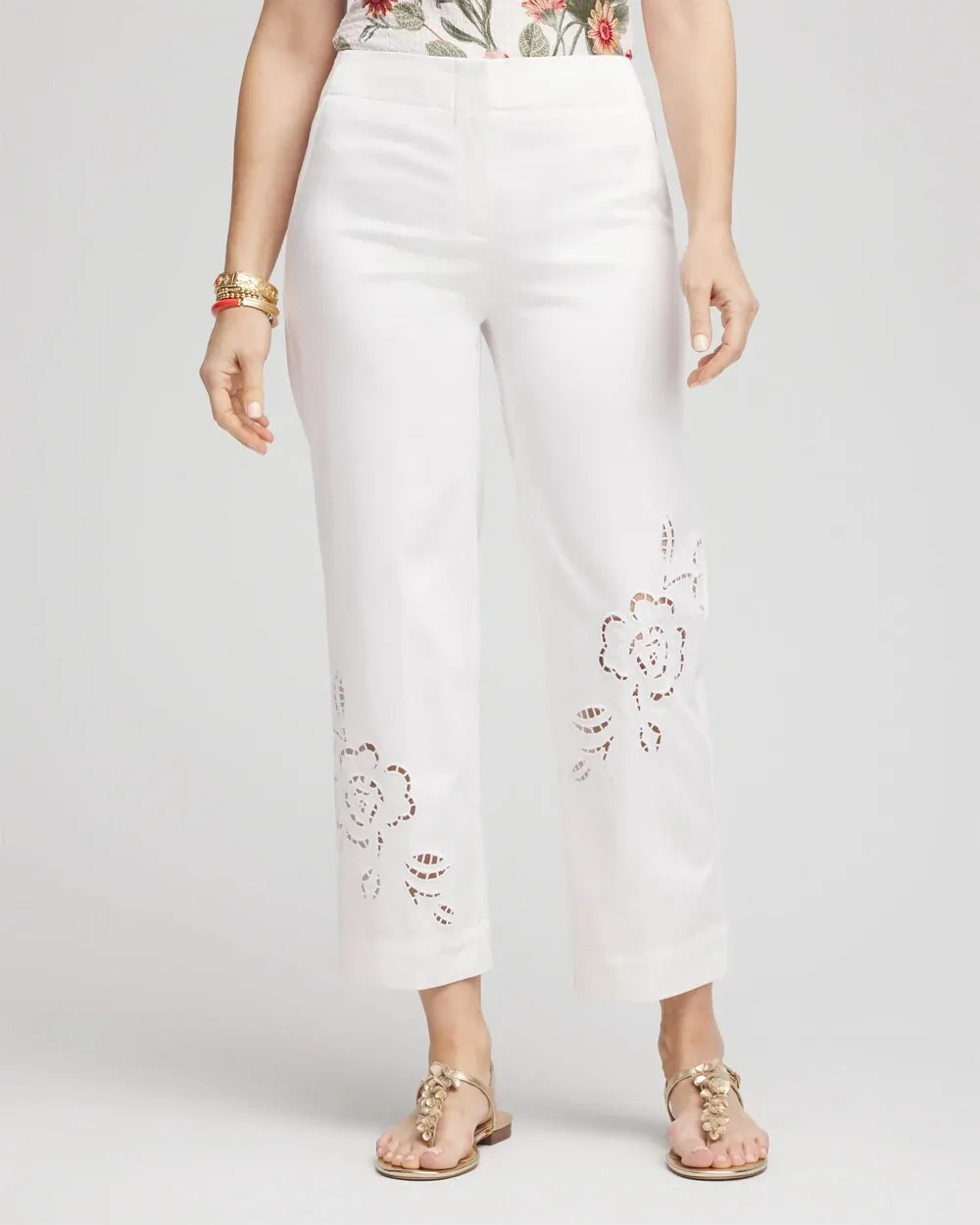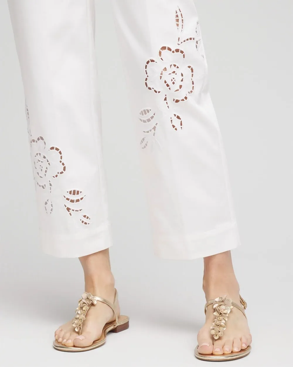 Upgrade your cropped pants wardrobe with new Sateen Cutout Cropped Pants. Featuring cutwork detailing knee to hems, front and back pockets.