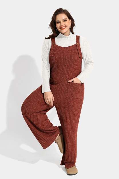 Solid Knit Wide Leg Jumpsuit with Adjustable Straps and Pockets