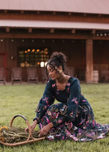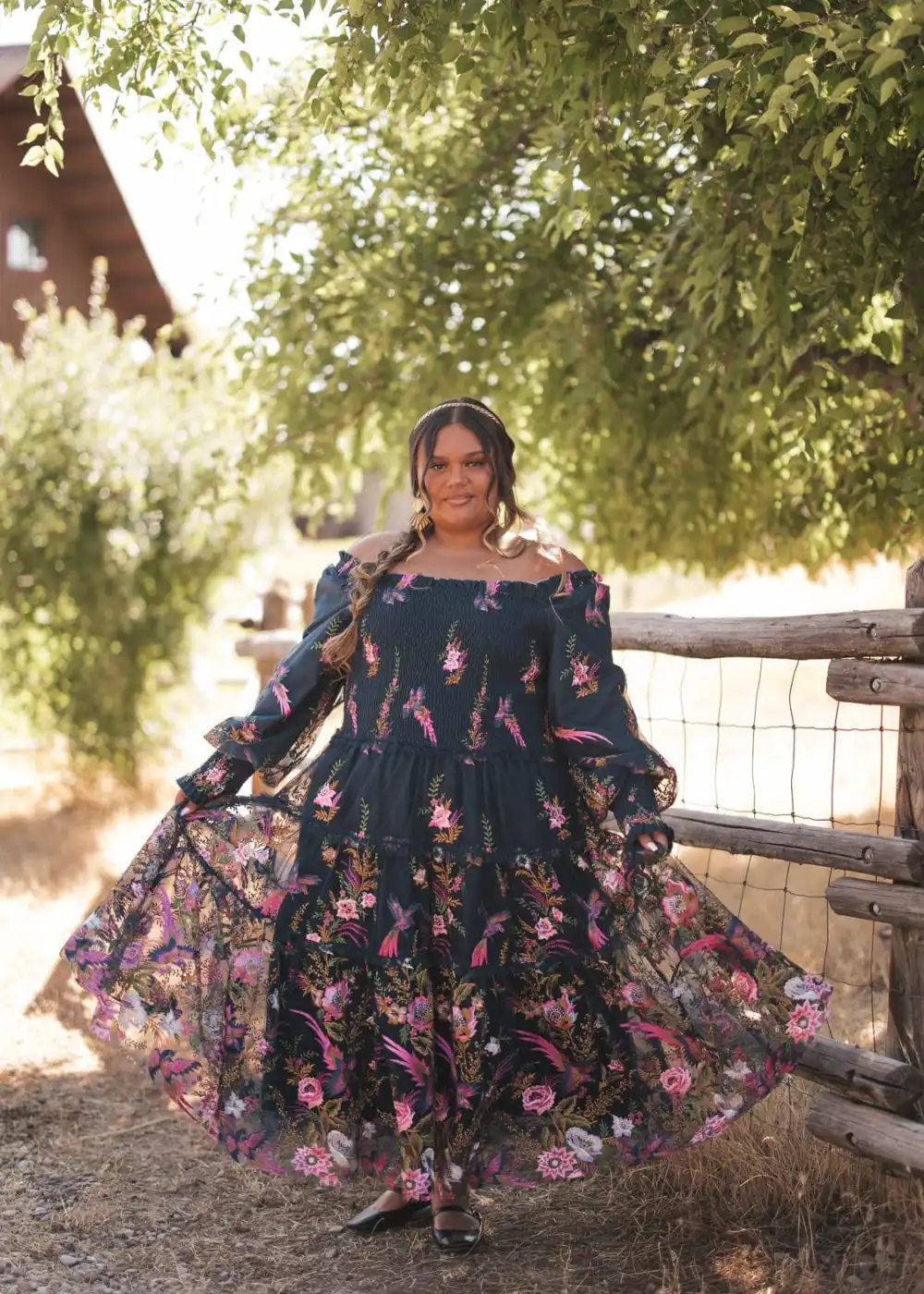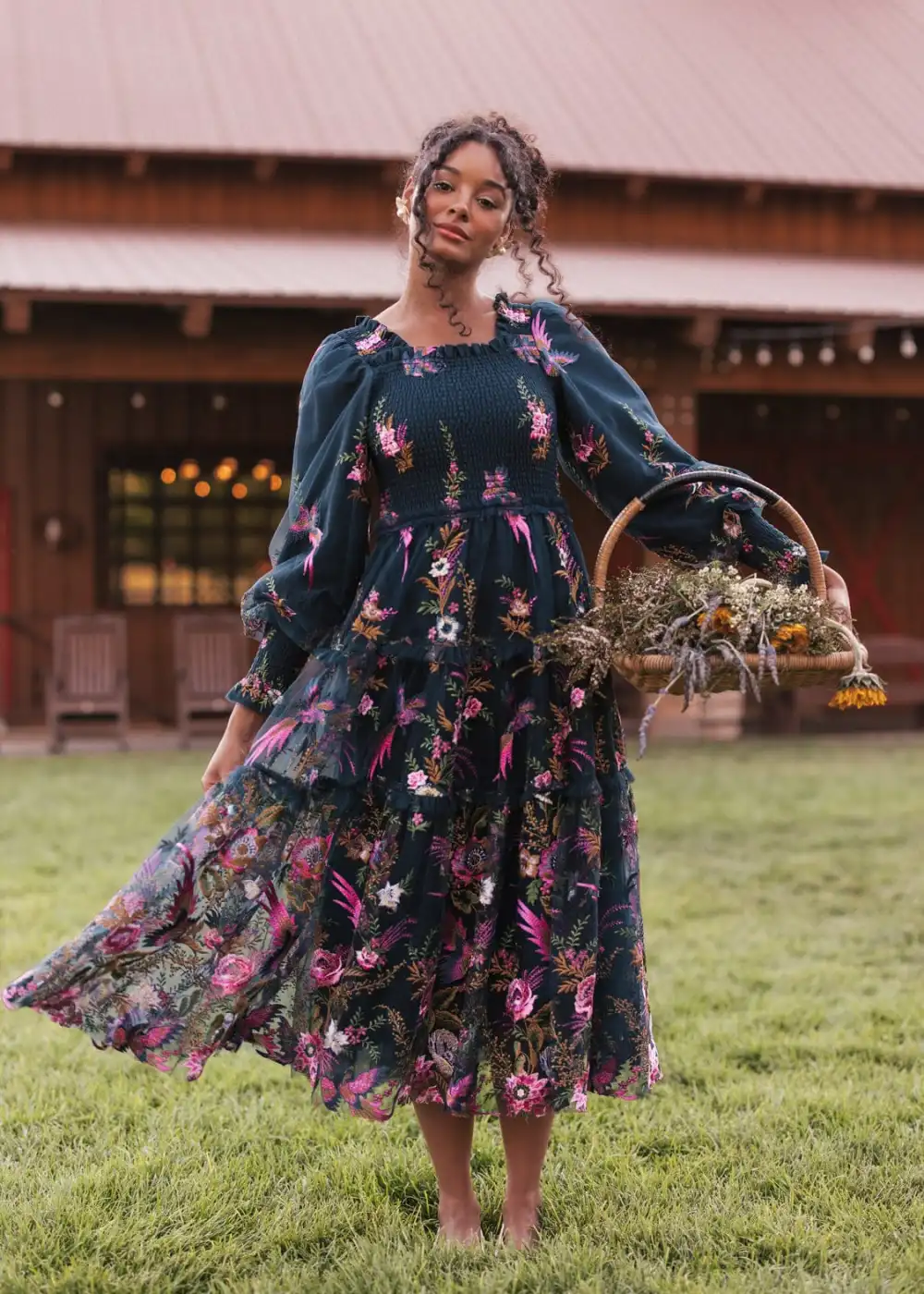 The Songbird Dress is a vibrant celebration of color and nature's beauty, featuring a deep navy base adorned with brilliant floral embroidery. The smocked bodice offers a flattering fit complemented by the voluminous, sheer puffed sleeves. The layered skirt showcases intricate patterns of pink, yellow, and green flowers that evoke the lively charm of a blooming garden. Perfect for both day and evening wear, the Songbird Dress effortlessly blends elegance and playful charm, making it a standout piece in any wardrobe.