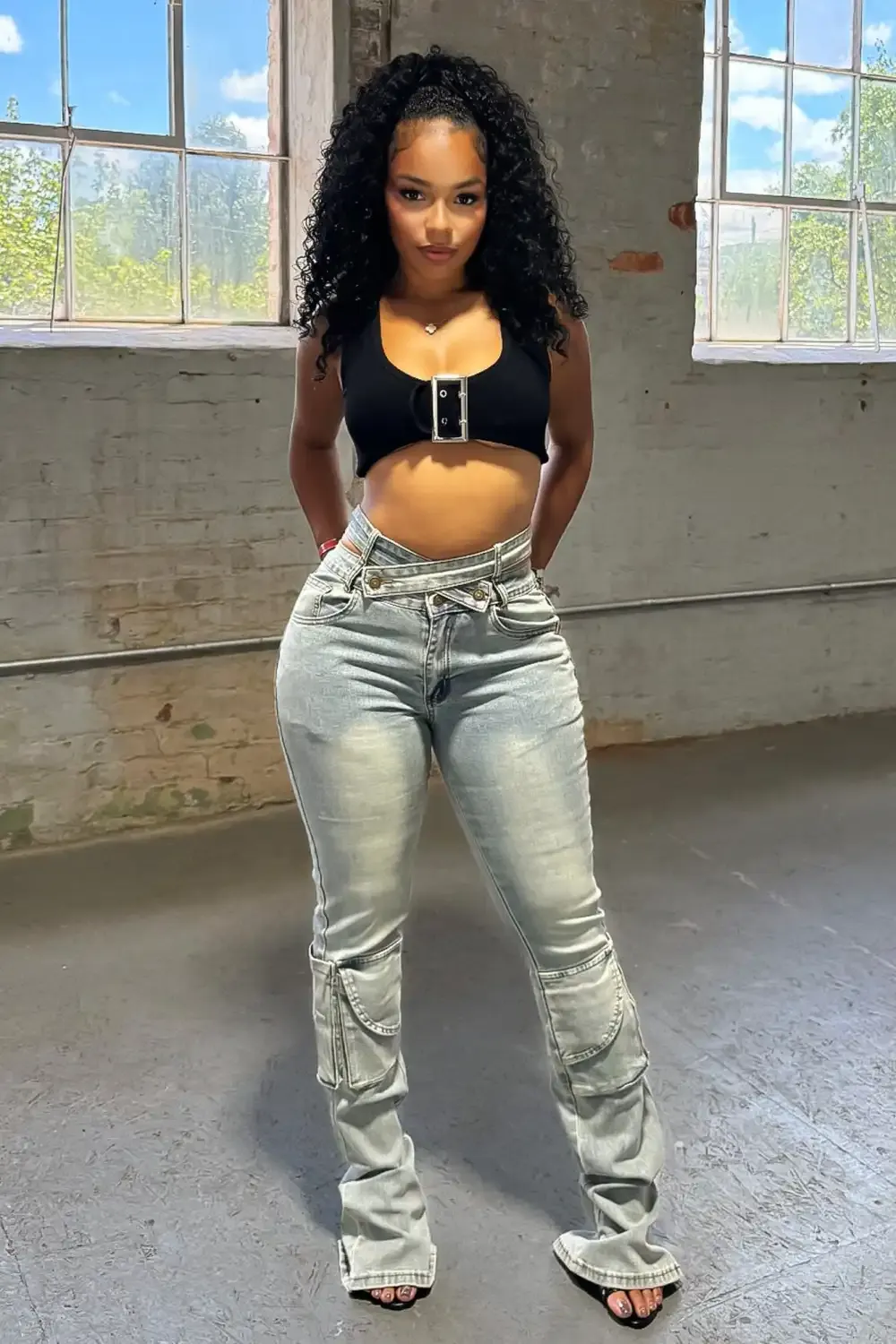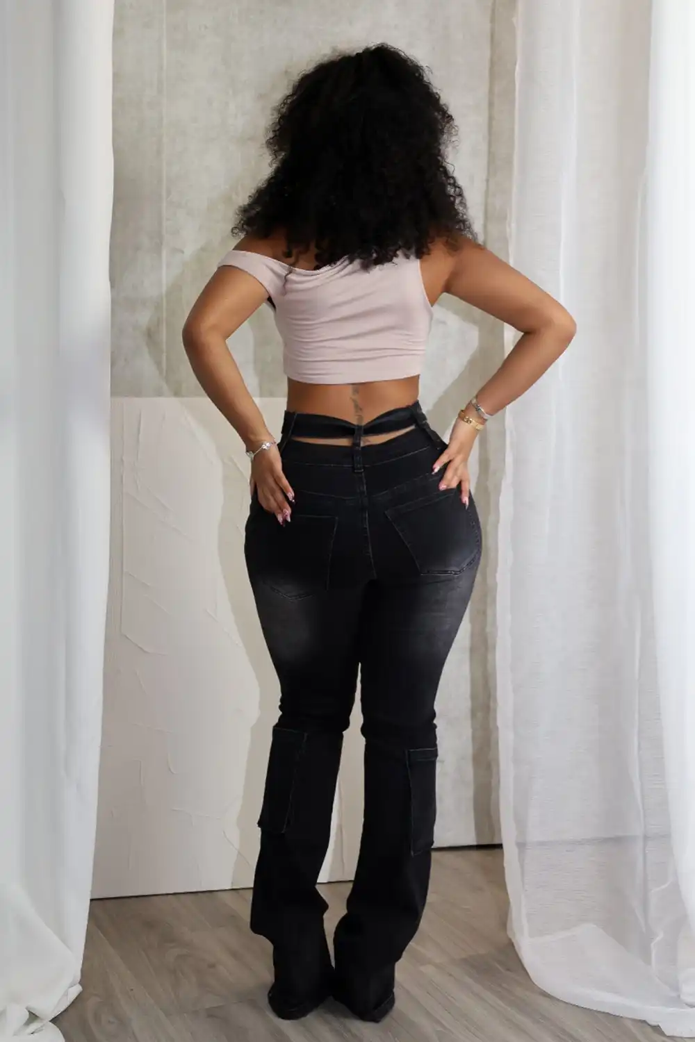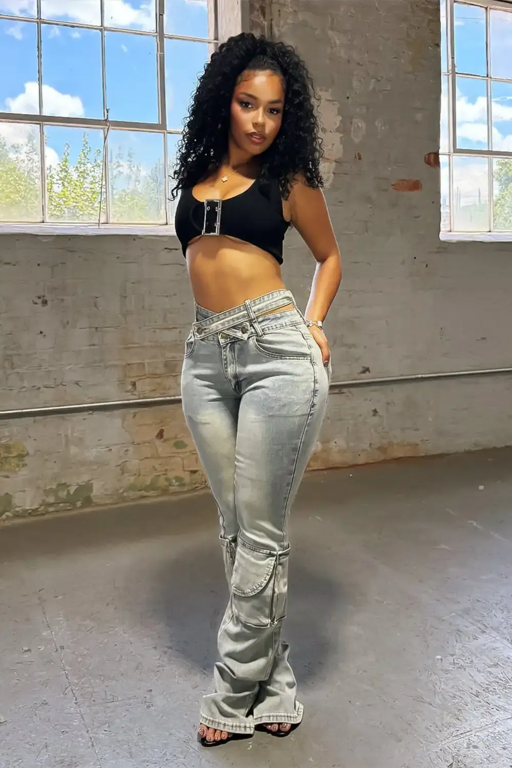 Vintage washed denim jeans featuring side cut out detail and cargo pockets