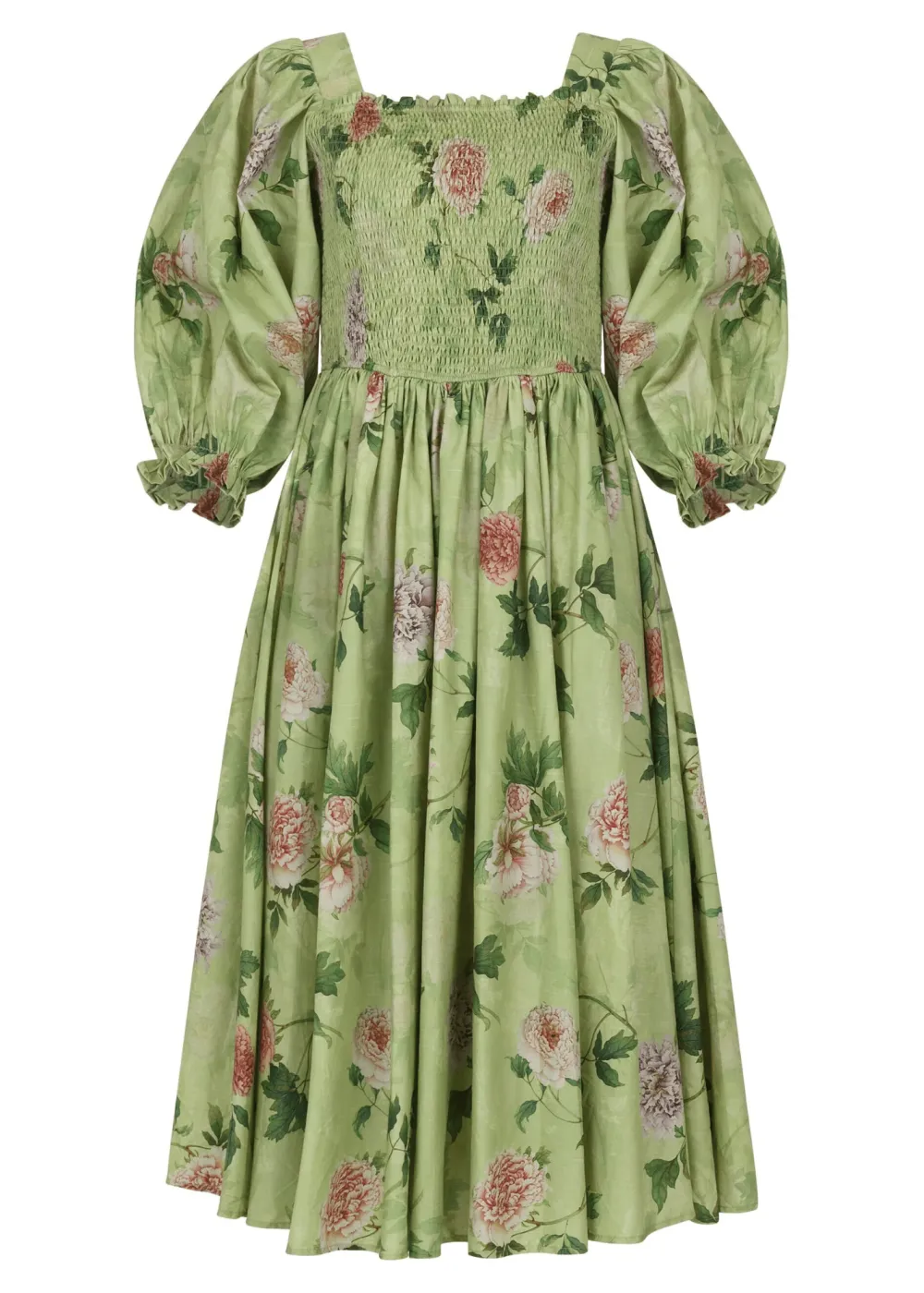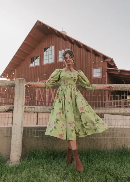 This lovely design embodies a dreamy, pastoral charm with its soft green hue and delicate floral pattern. The dress features a smocked bodice that offers a flattering, comfortable fit, while the voluminous, puffed sleeves and square neckline add a touch of vintage elegance. Embrace a timeless, country chic style with the Wren Dress!