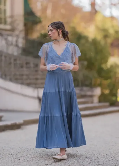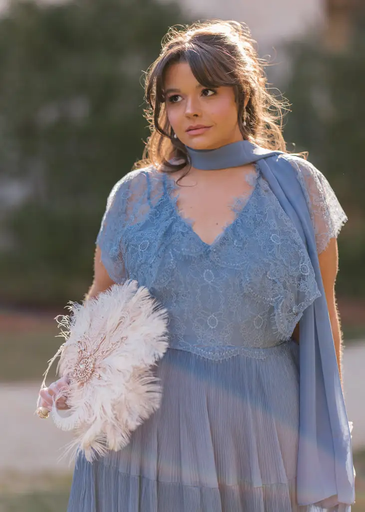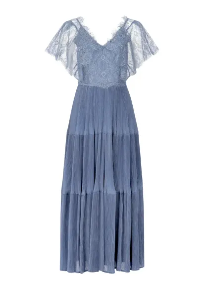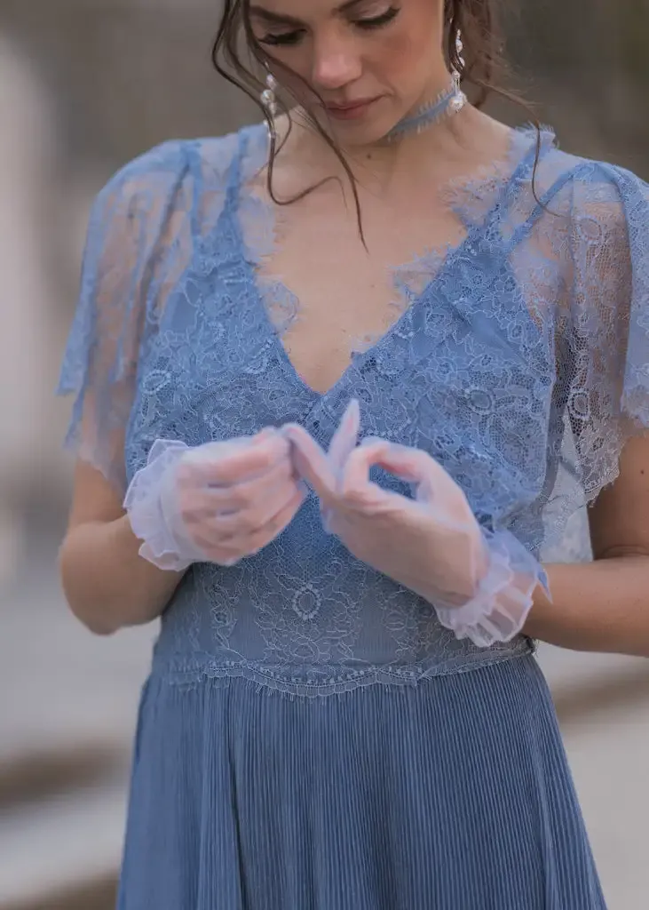 The Zuri Dress exudes elegance and romance with its intricate lace bodice and flutter sleeves. The flowy pleated skirt cascades gracefully in tiers, creating a timeless silhouette perfect for formal events or special occasions. With its soft, dreamy blue hue and delicate detailing, this dress is designed to make you feel effortlessly sophisticated and beautiful.